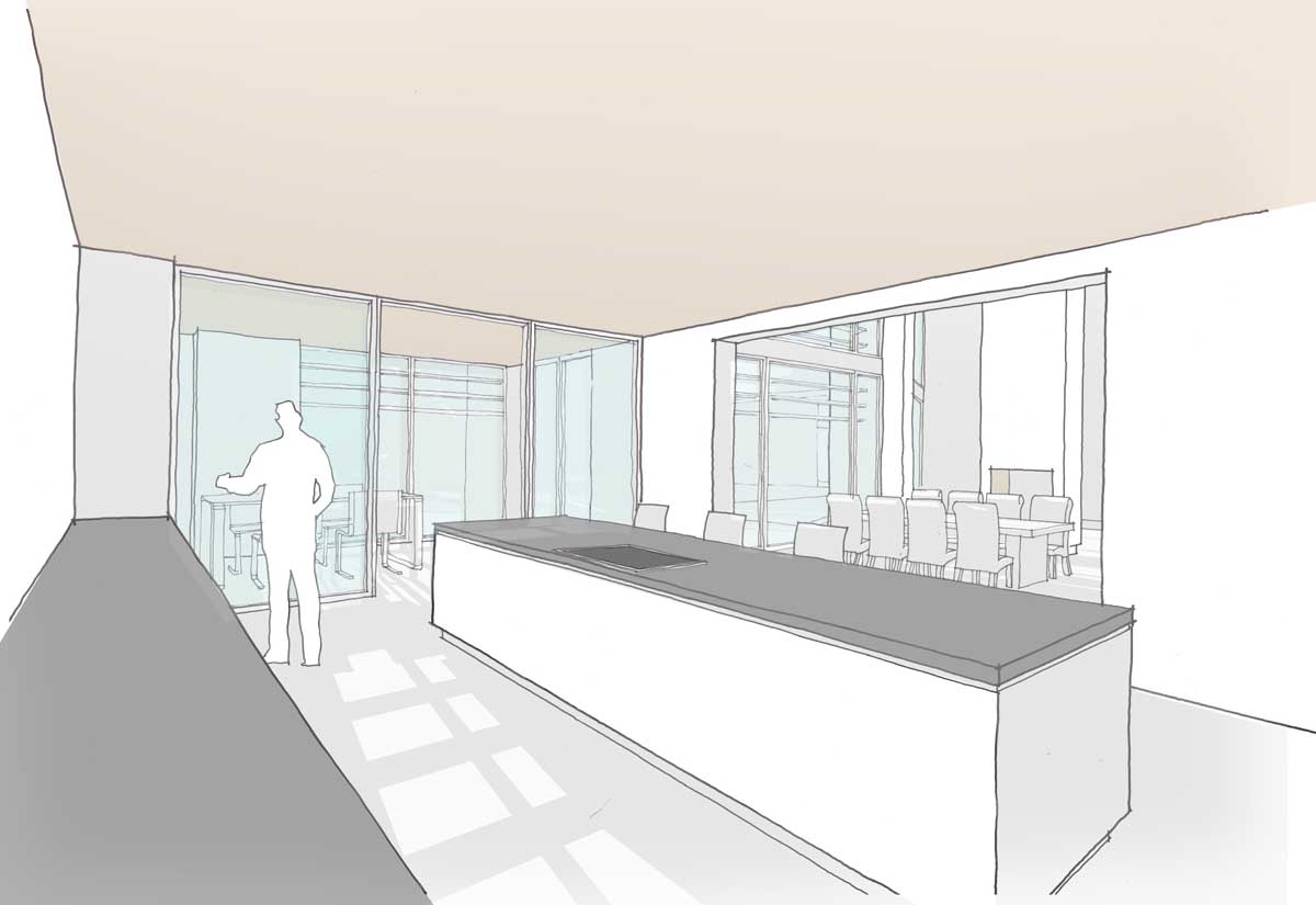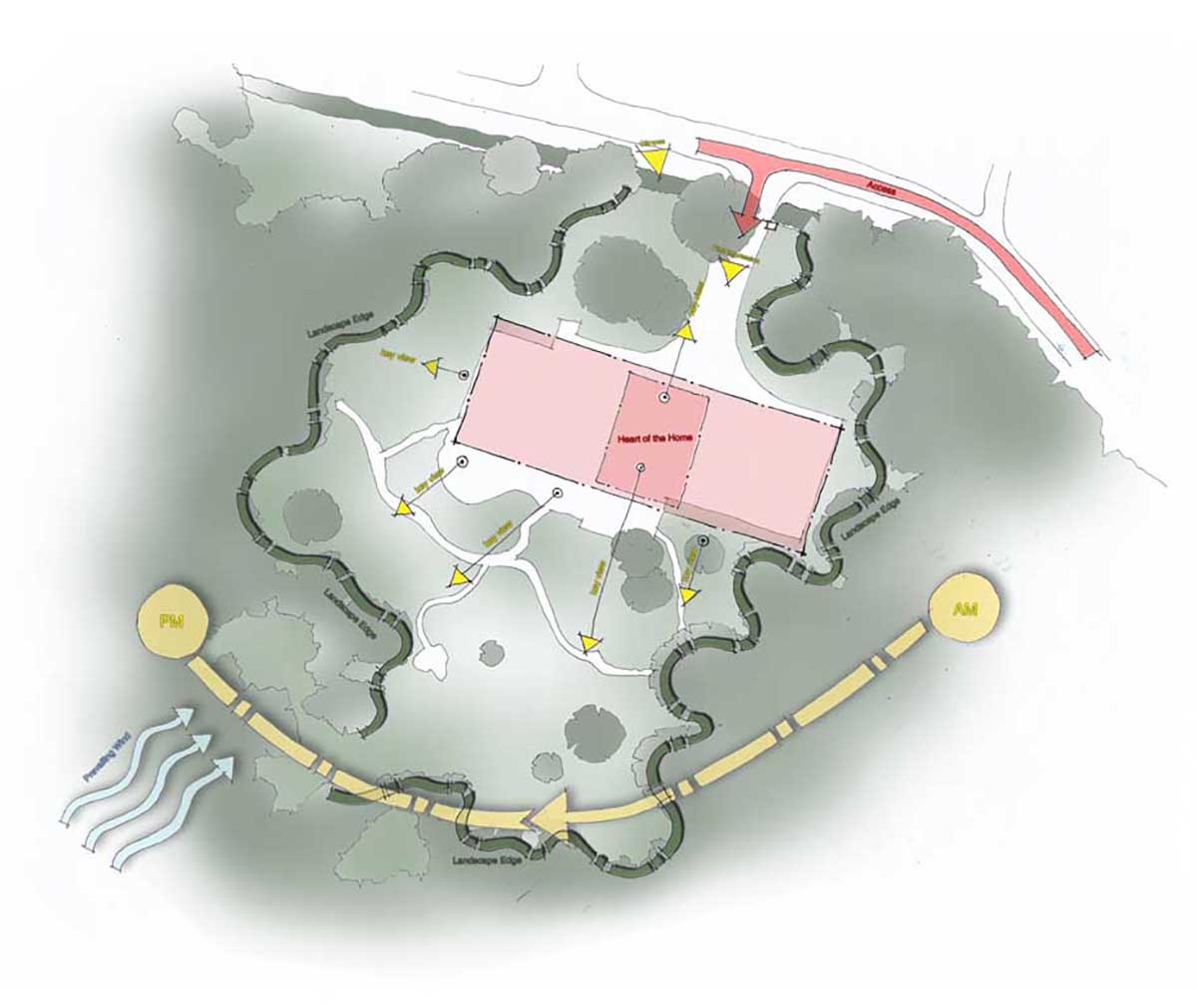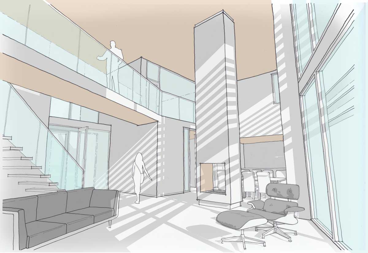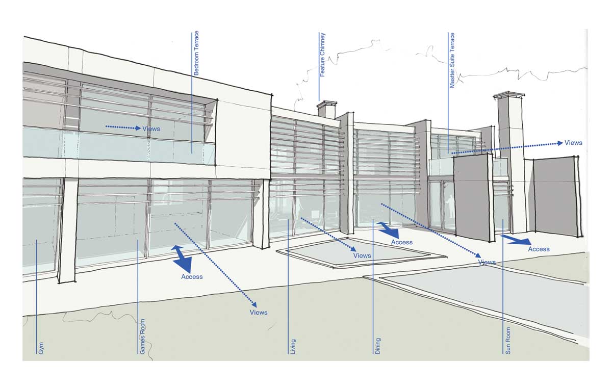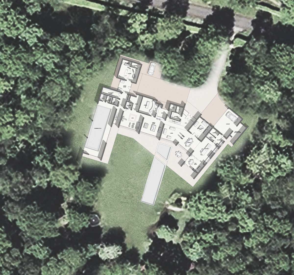 The concept of the house is derived from key axis through the site and views south to the gardens and woodland beyond. A transparent double height entrance / living room forms the heart of the home connecting the other living and bedroom areas. Concrete spine walls add thermal mass and frame key views from the main living spaces with the large sliding glass walls giving a flameless appearance and easy access to the garden. Living spaces and bedrooms have been orientated to take advantage of the views south with ancillary spaces including cinema and recording studios facing north.