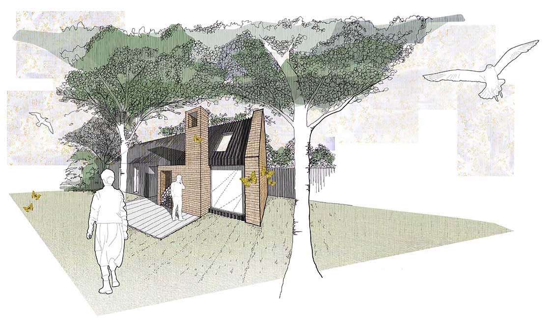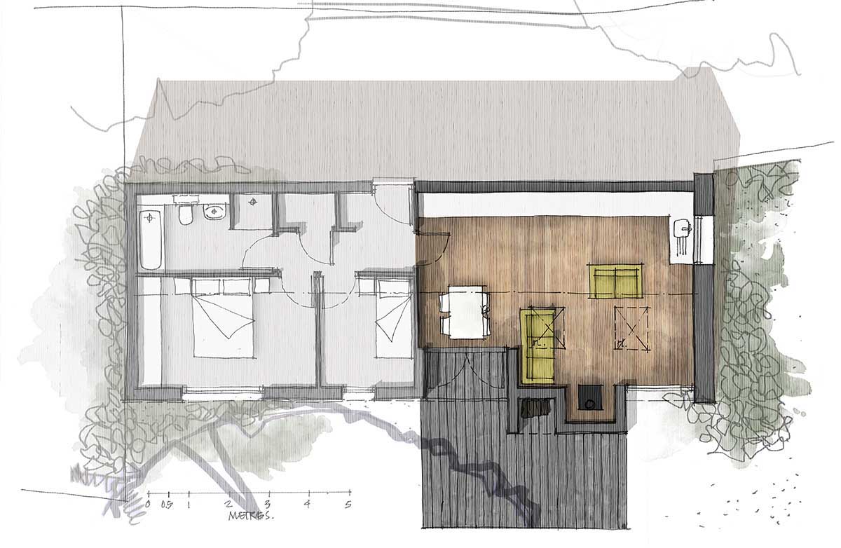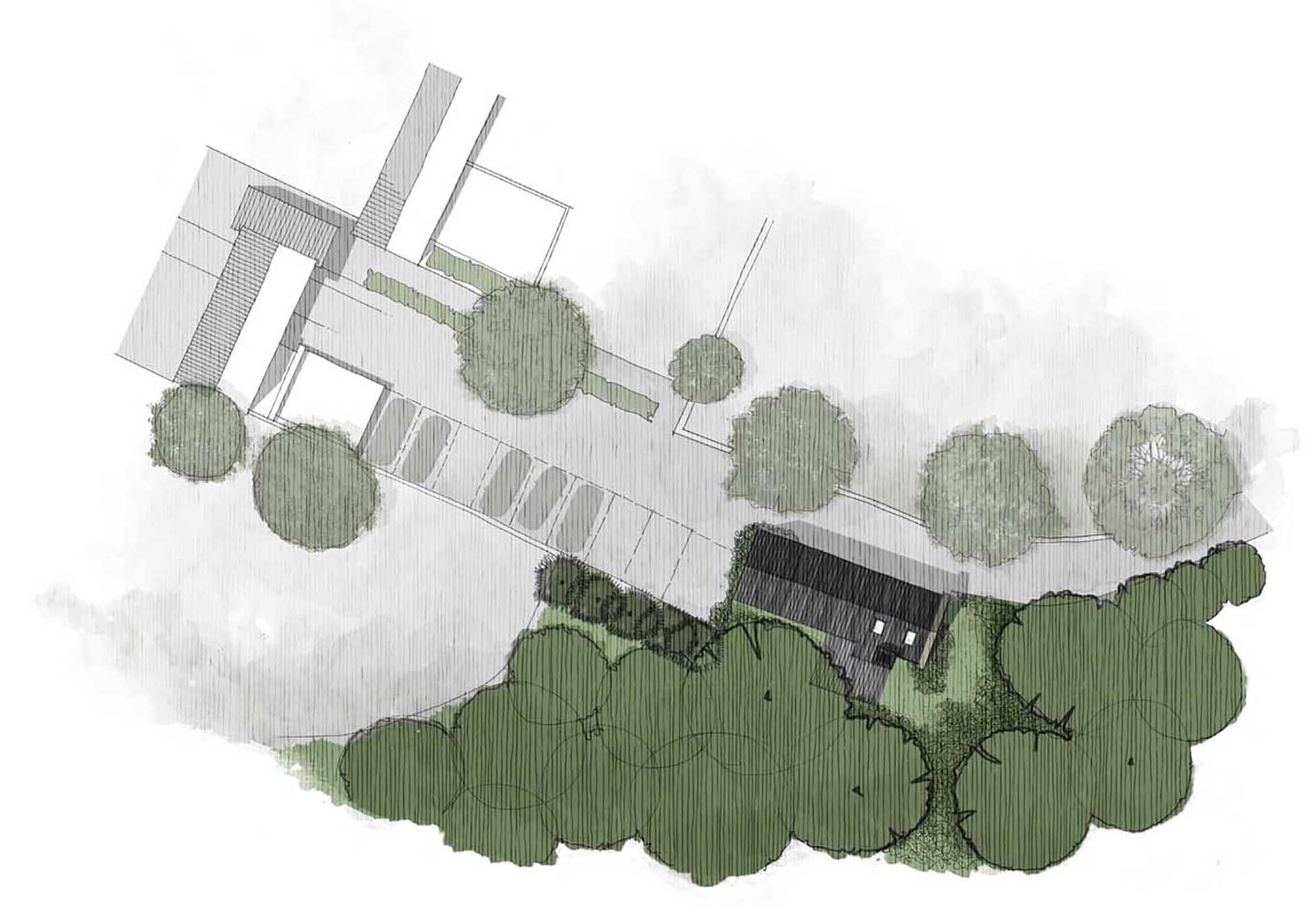The simple form is designed to invoke a sense of refuge and connects with the natural surroundings, and complements the other agricultural buildings on site. The proposed hut has fully glazed areas which open to the neighbouring woodland and providing glorious views.