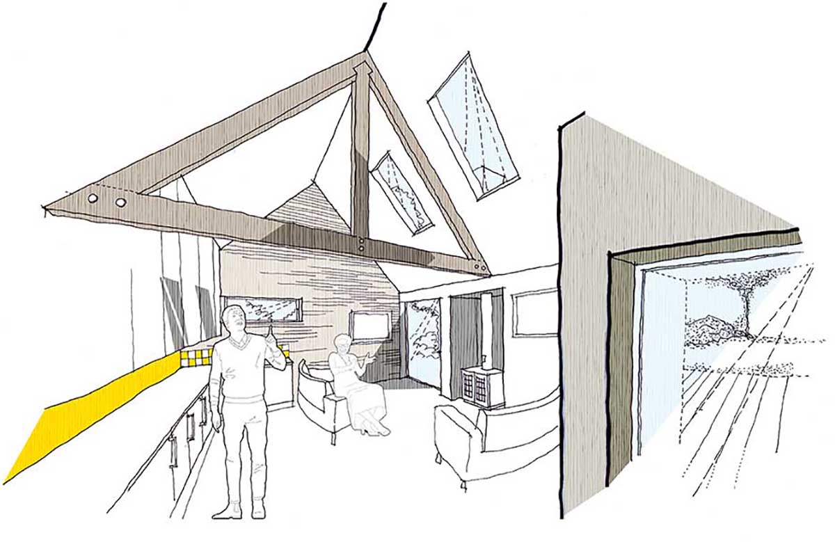 The cabin is far from primitive and has been designed with everything from a free standing wood burning stove to vaulted internal spaces with specialist structural elements.