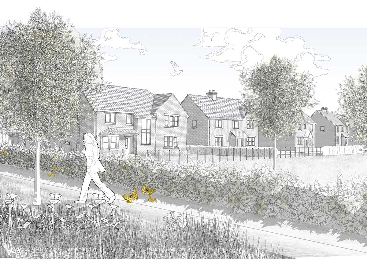 Green Lane is a residential masterplan providing 735 dwellings located to the south of Yarm town centre. The site is divided by an existing rail line into east and west development cells. Key considerations in the formation of scheme proposals was how the masterplan responded positively to the northern and southern boundary, with sloped topography allowing development to take advantage of open views over the southern plantation. Key landscape corridors, informed by the existing site features, link smaller green spaces to the generous southern green edge. Pod have subsequently been engaged by Bellway Homes in the delivery of the western development cell, Conyers Green.