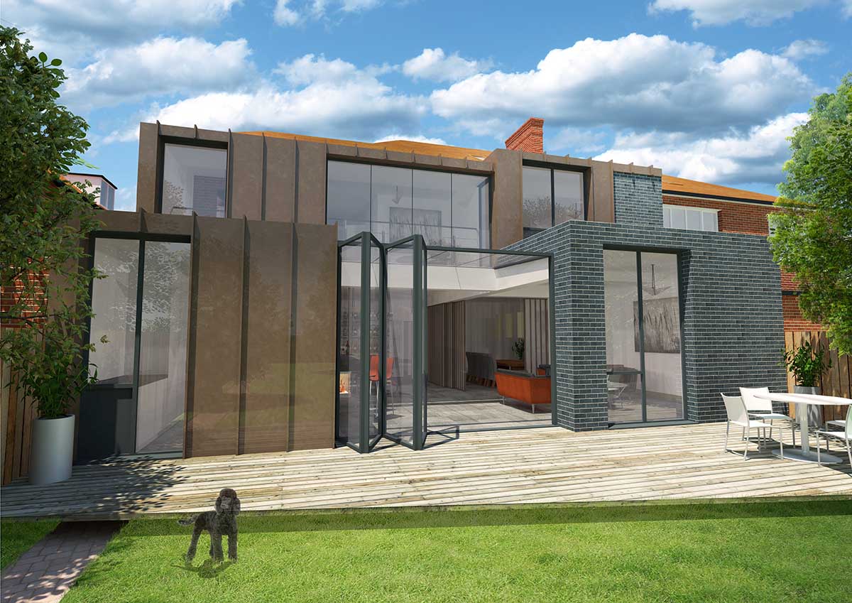 A commission which involved the re-modelling of the entire rear elevation of a late Edwardian dwelling. Conceived as truly contemporary design response, the zinc clad exterior acts as a complimentary material adjunct to the traditional Edwardian palette of red facing brick and clay roof tile.