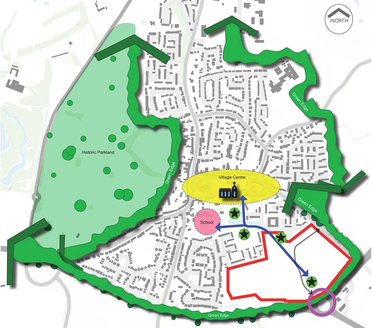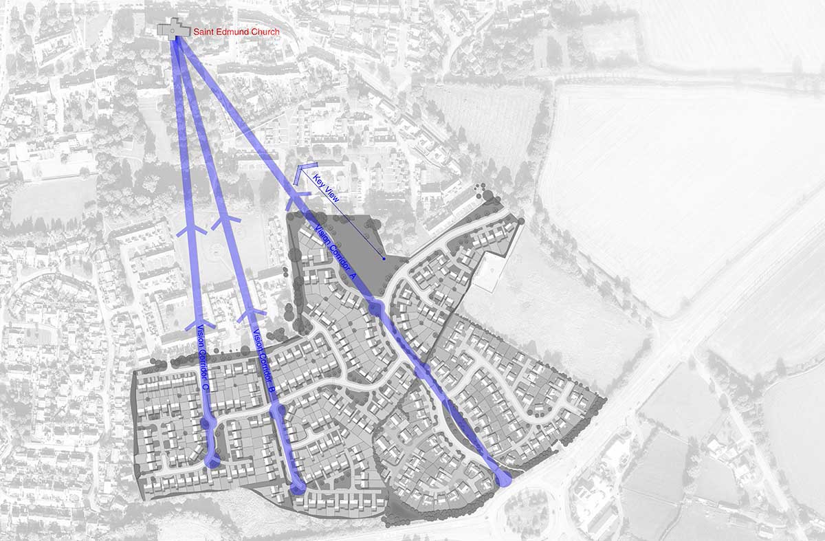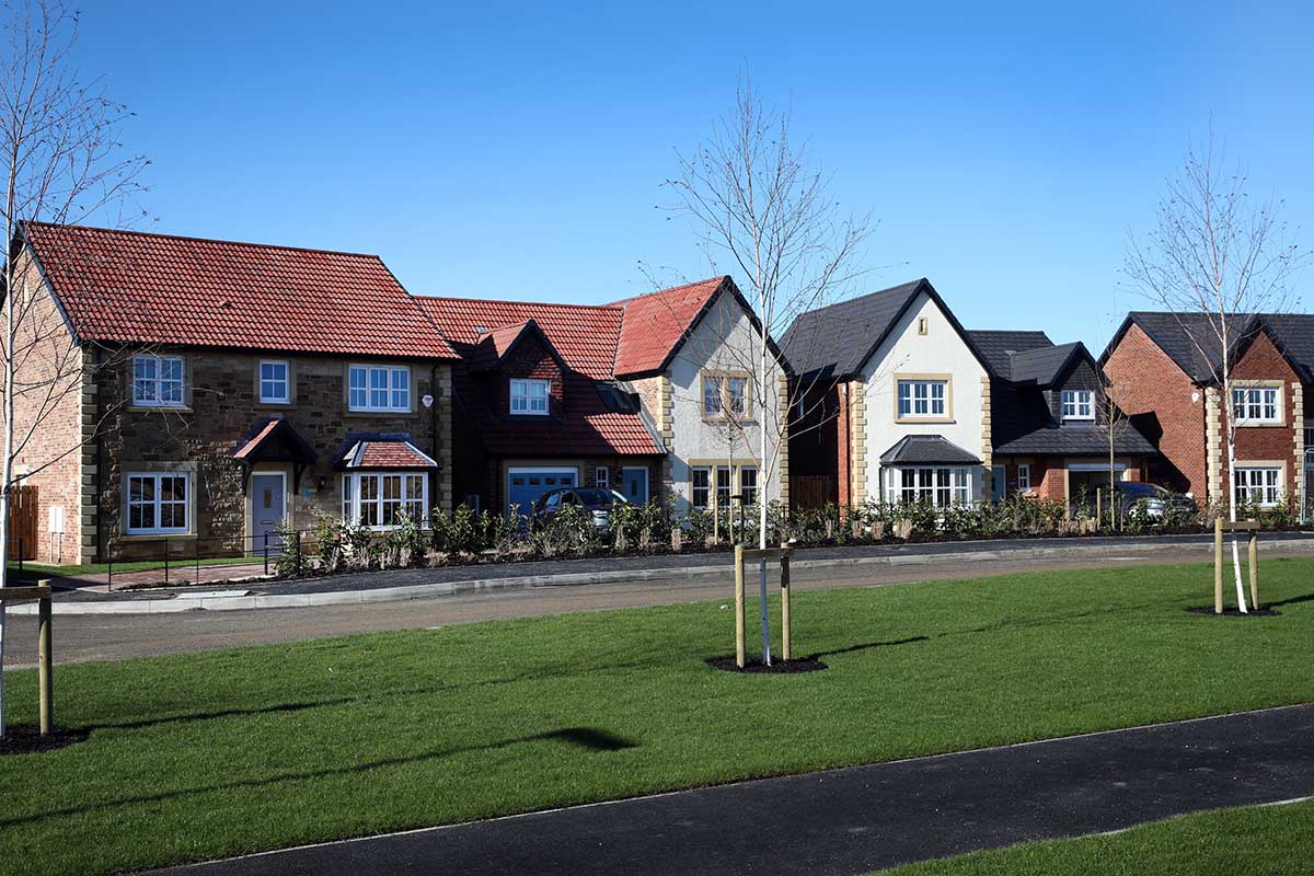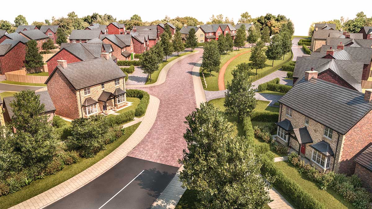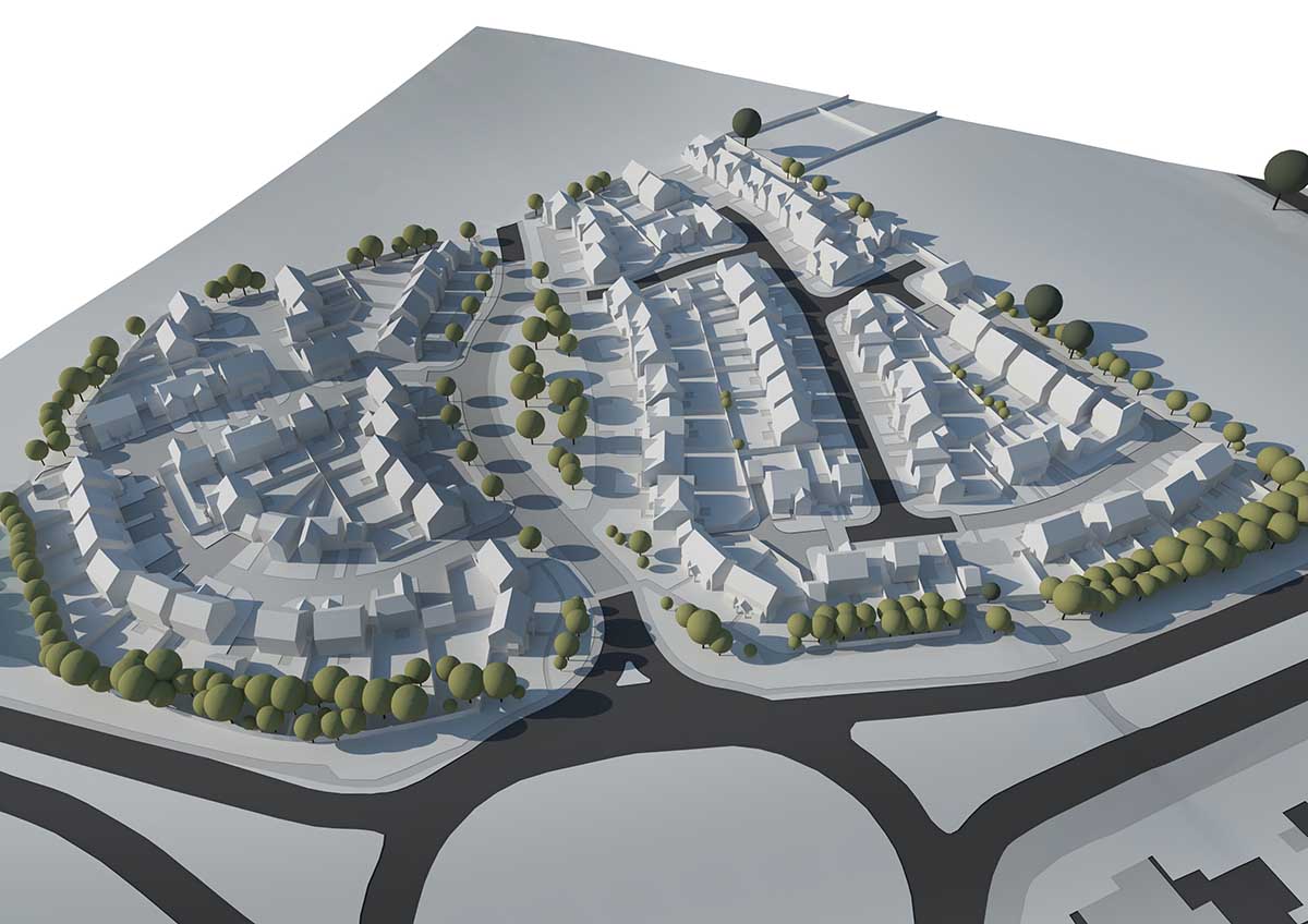 Pod provided masterplanning and detailed design services for St Edmund’s Manor, to the south of Sedgefield town centre. The visually sensitive site included existing mature landscape features and views of St Edmunds Church. Embracing the church tower as a nodal point, the entrance and elliptical open space have been designed to frame this viewpoint creating a real sense of place. The 350 dwelling development adopts a traditional aesthetic with stone facing units employed to emphasise key view stops or to accentuate dual aspect dwellings.