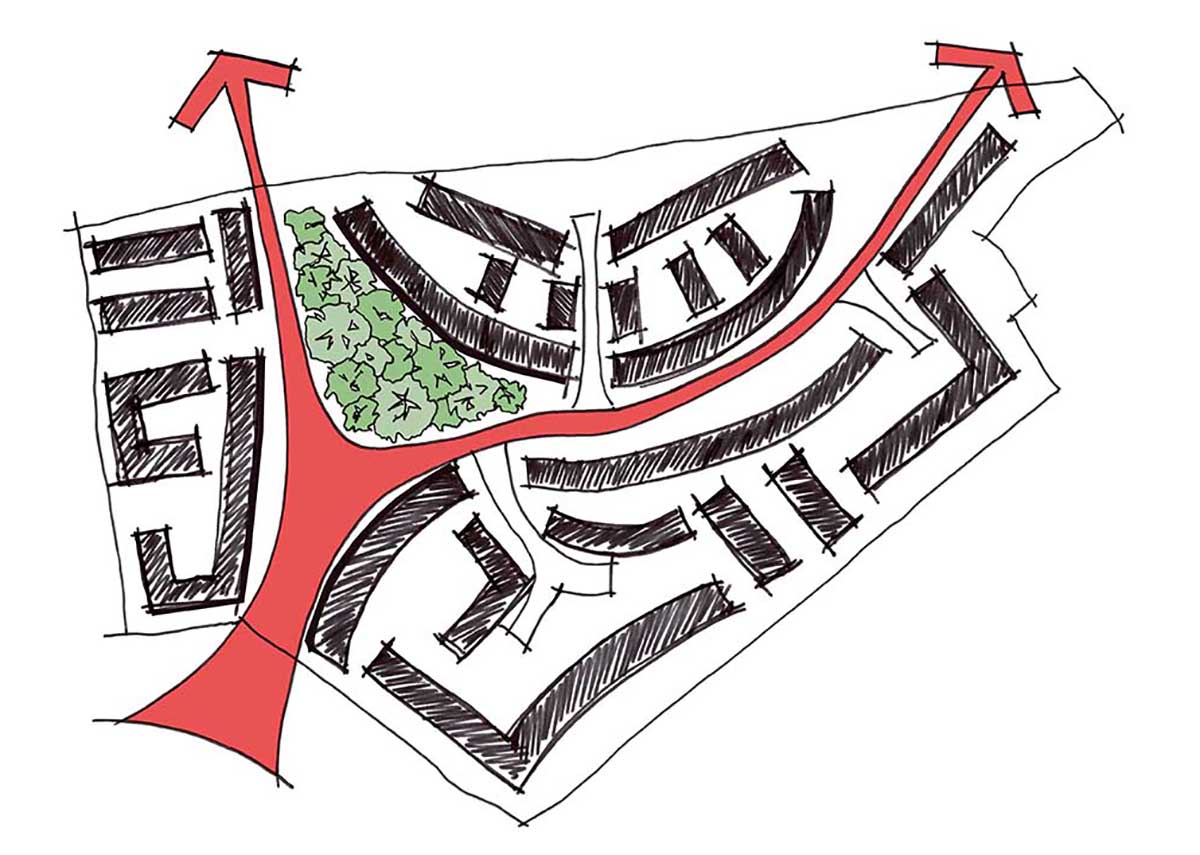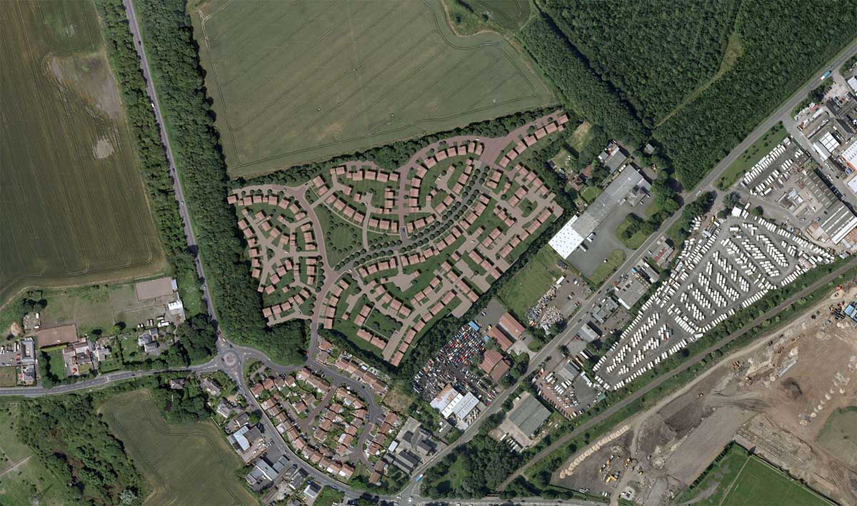 Wheatridge Park is a development of 190 homes which adopts a sinuous masterplan approach, proposing sweeping avenues and generous curved open spaces to create a meaningful green heart to the scheme. The relatively low density nature of development has allowed large detached dwellings to be orientated with aspect over key development boundaries and open views to the northern edge. In contrast, the southern development edge promotes an inward character with higher density terraced forms configured to screen views of the adjacent scrap yard.